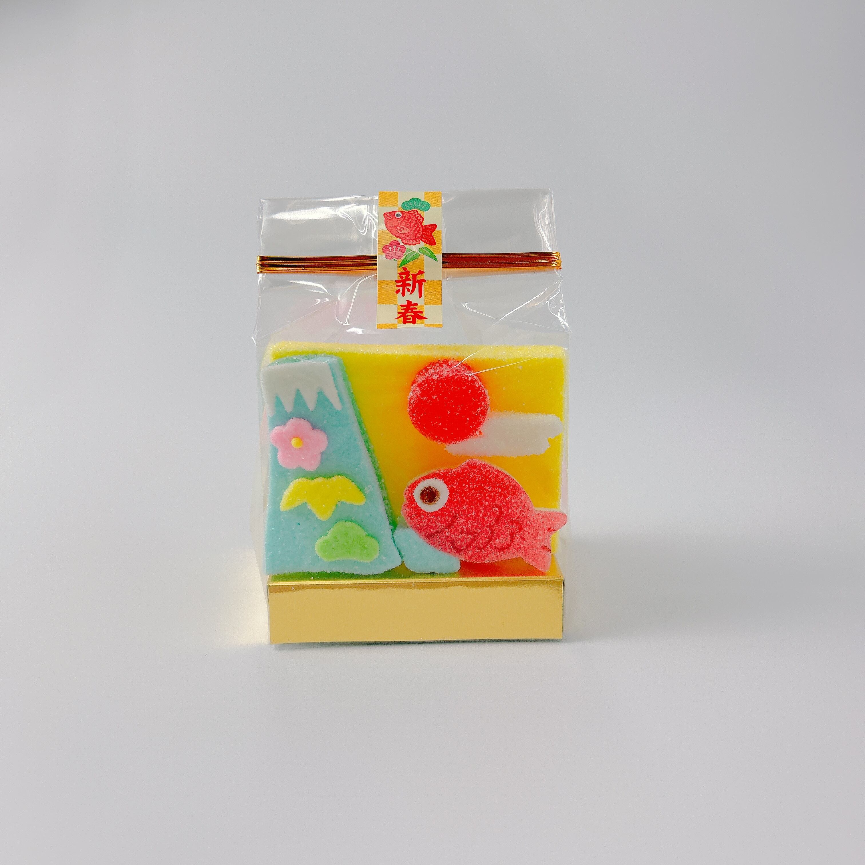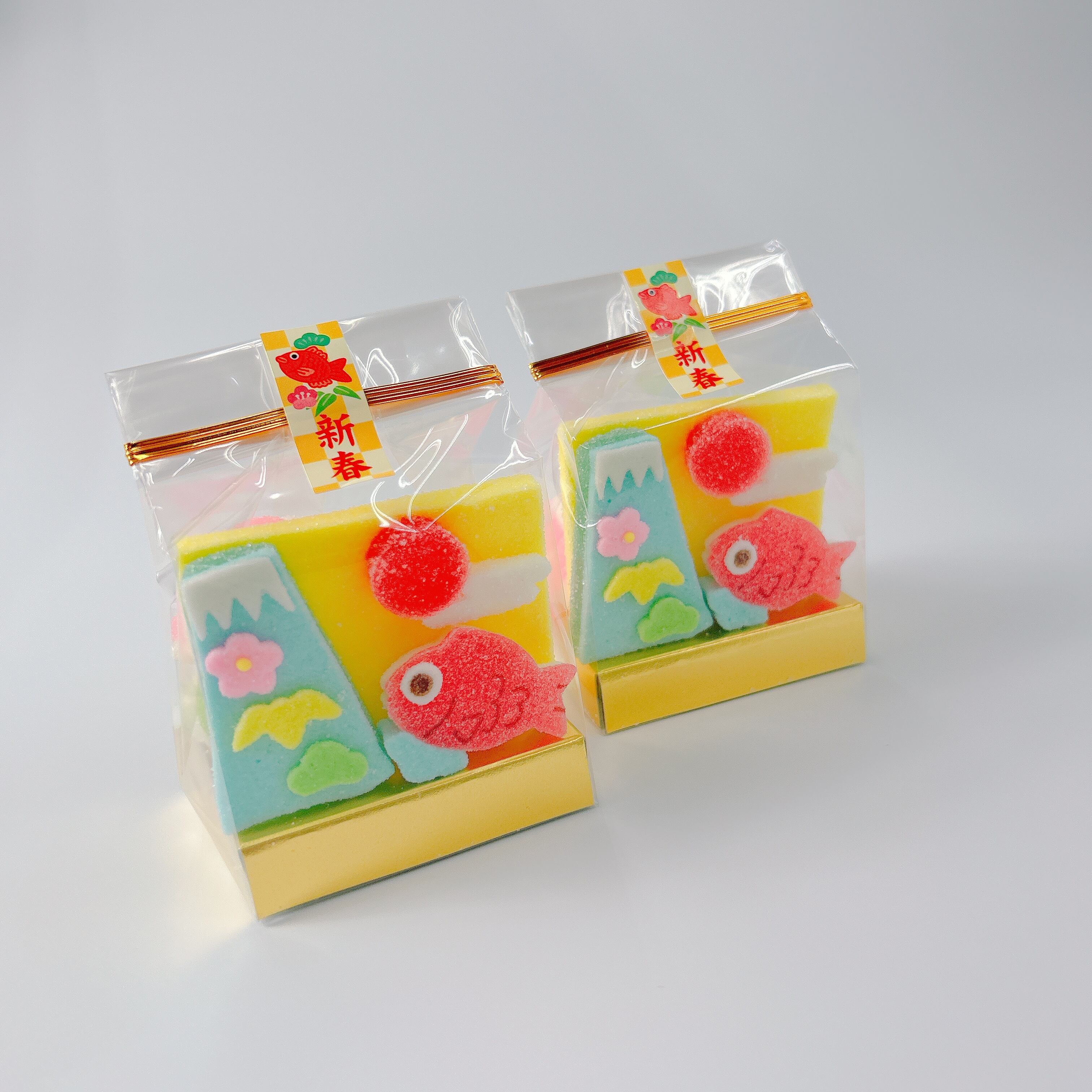 鯛や富士山、初日の出など新年の縁起物の寒天細工ゼリーが入った商品です