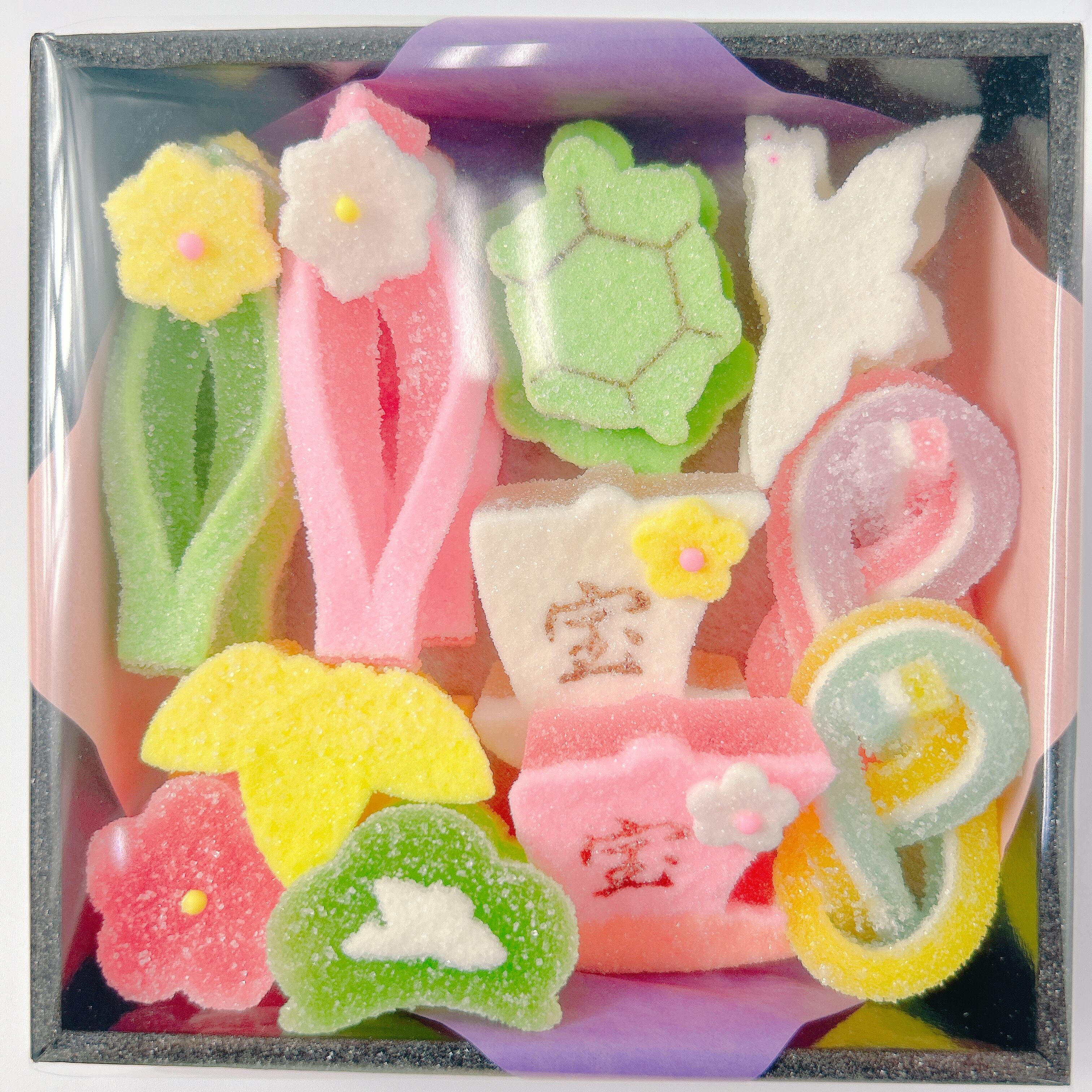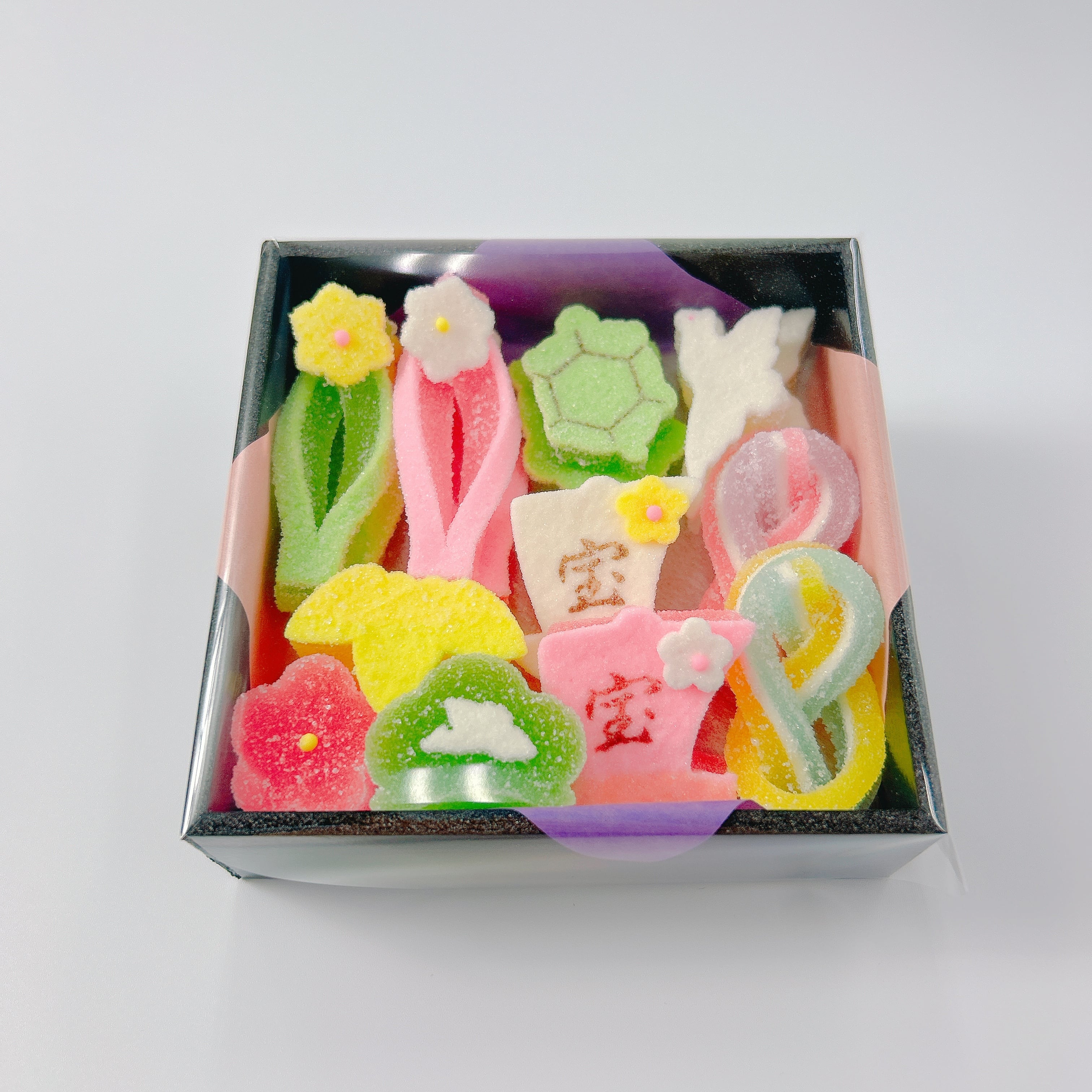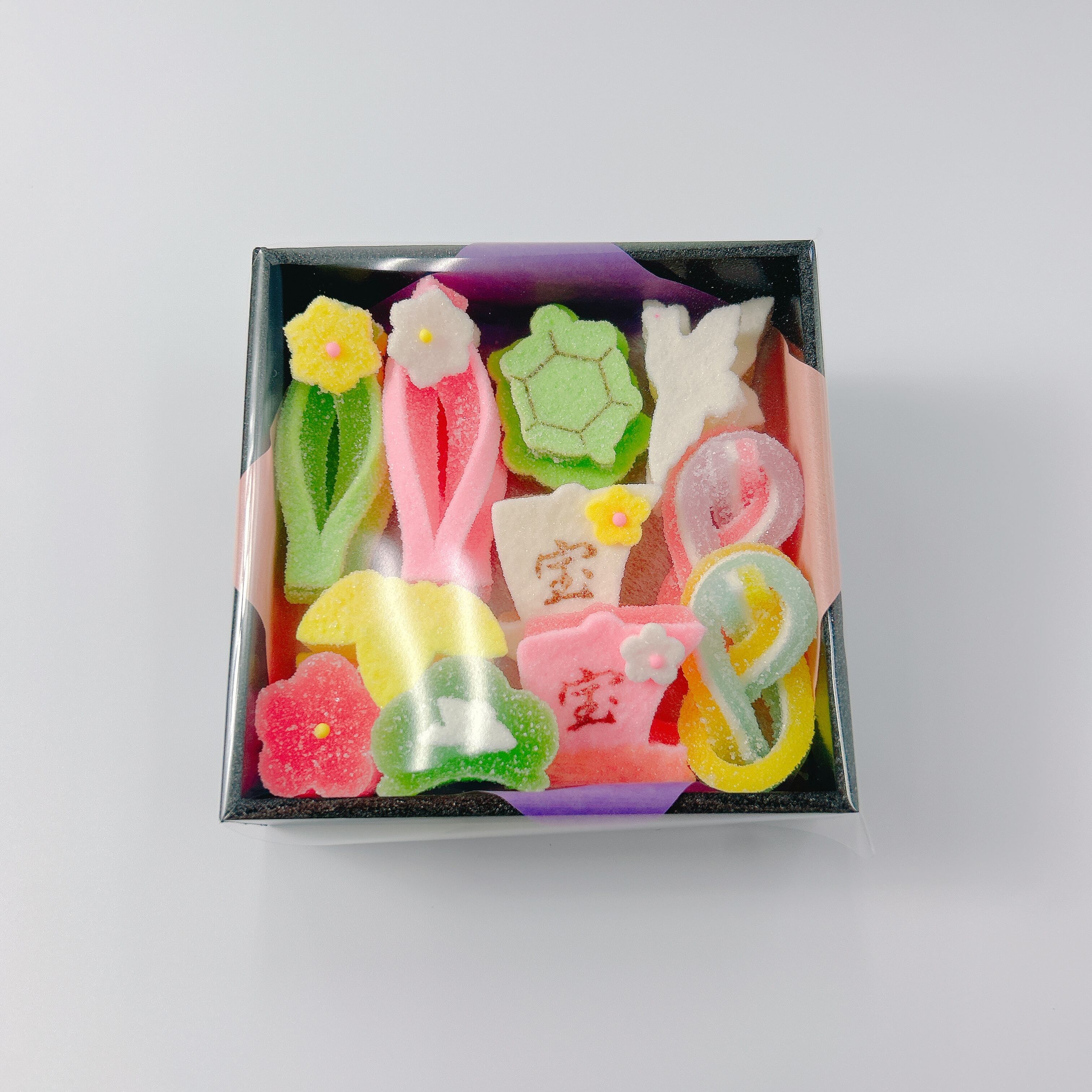 親子鶴、亀、宝船に松竹梅などお正月にふさわしいたくさんの寒天細工ゼリーが入ってます