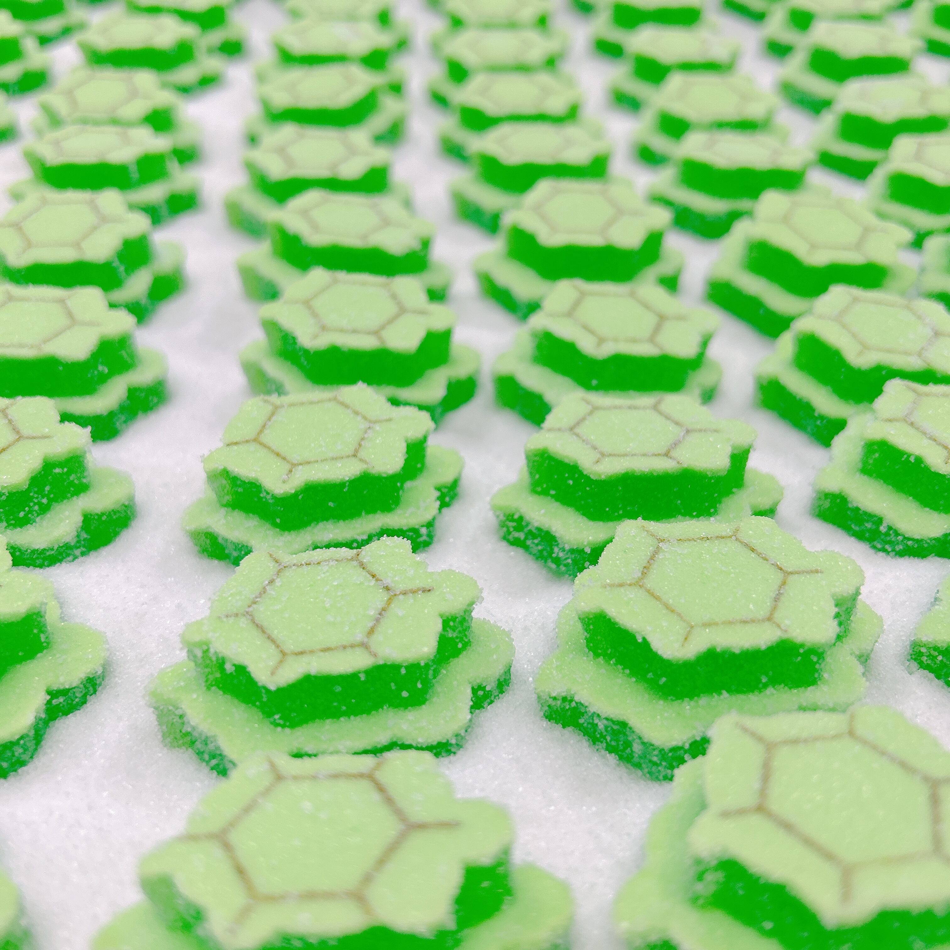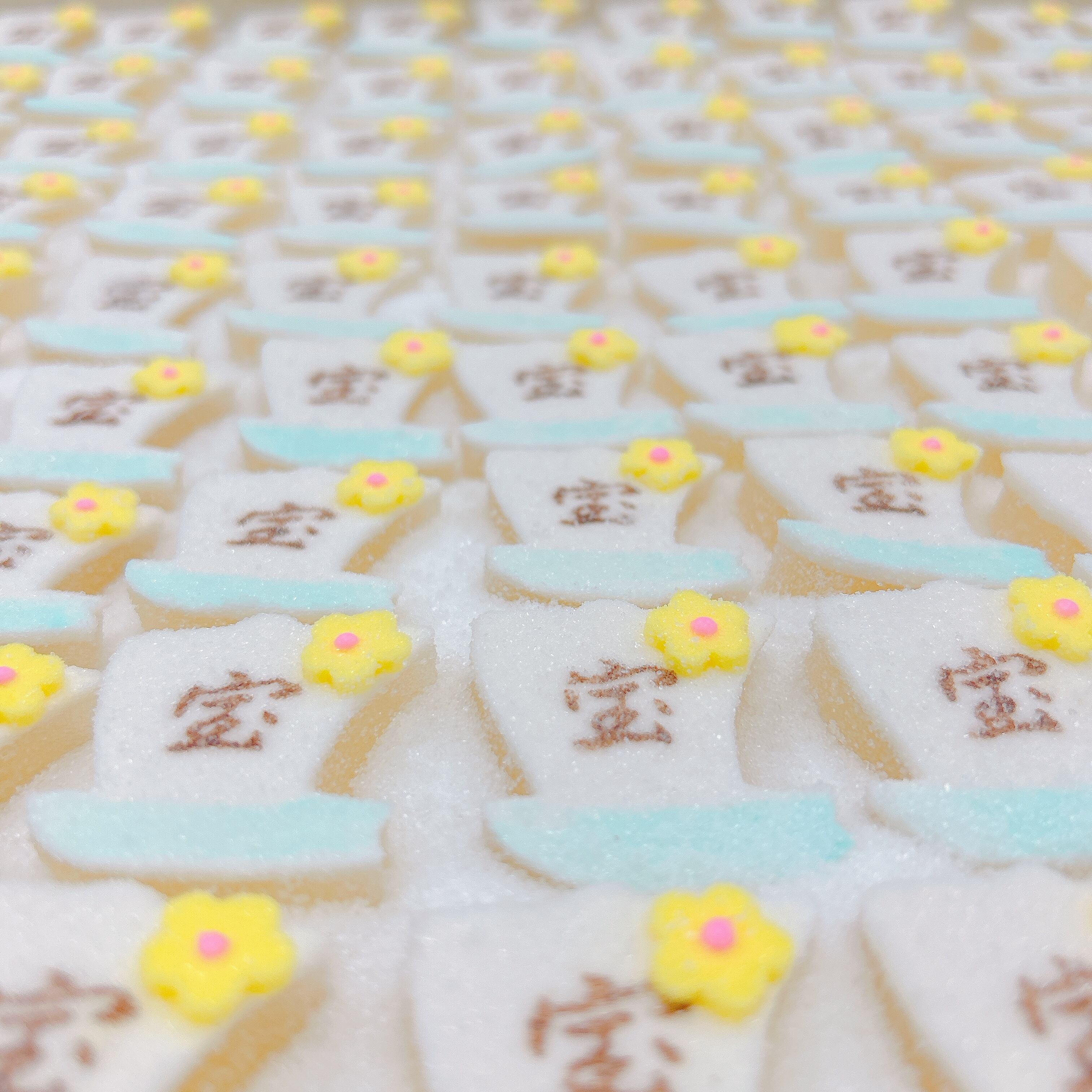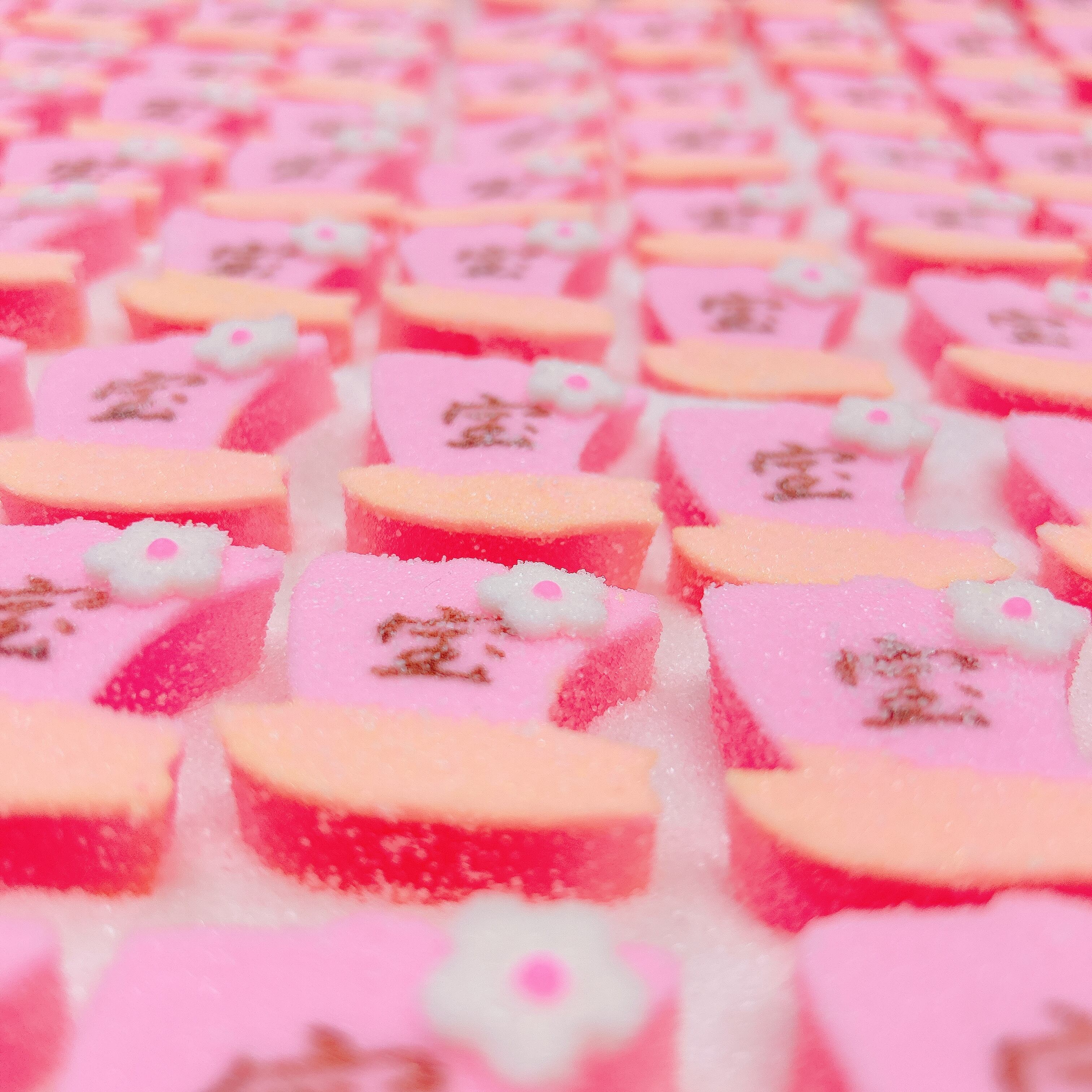 親子鶴、亀、宝船に松竹梅などお正月にふさわしいたくさんの寒天細工ゼリーが入ってます