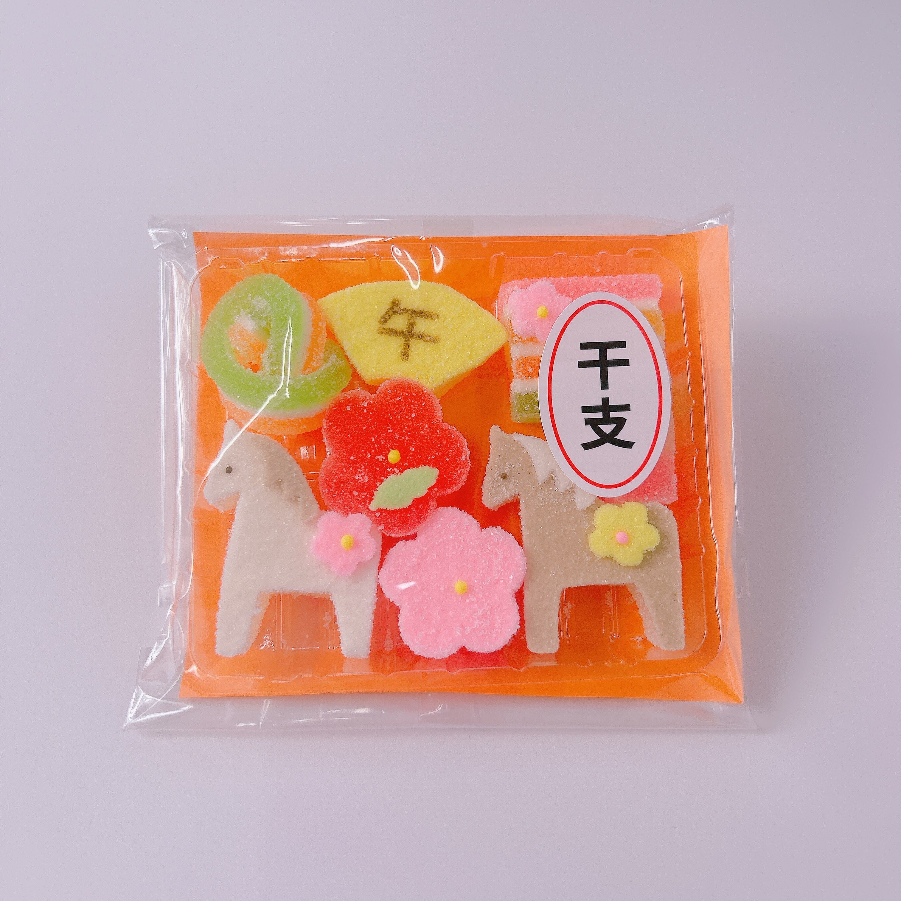 今年の干支である「午」を主役に、平皿に梅や末広を詰めた商品です