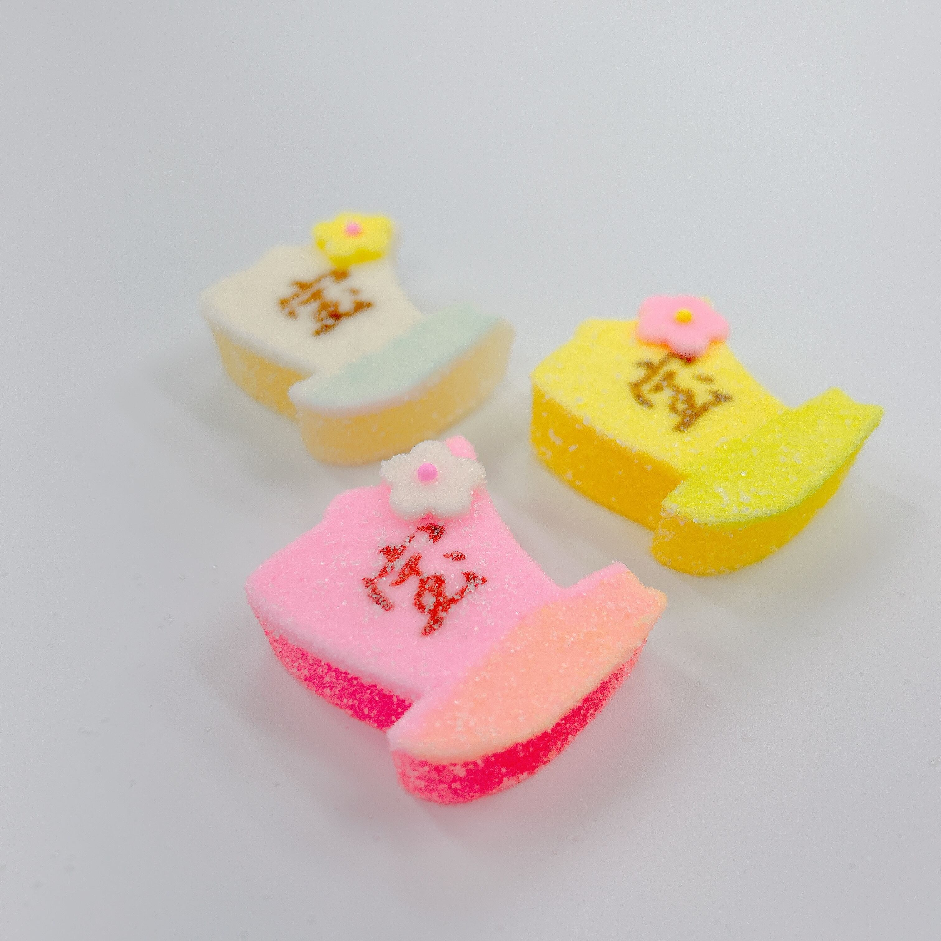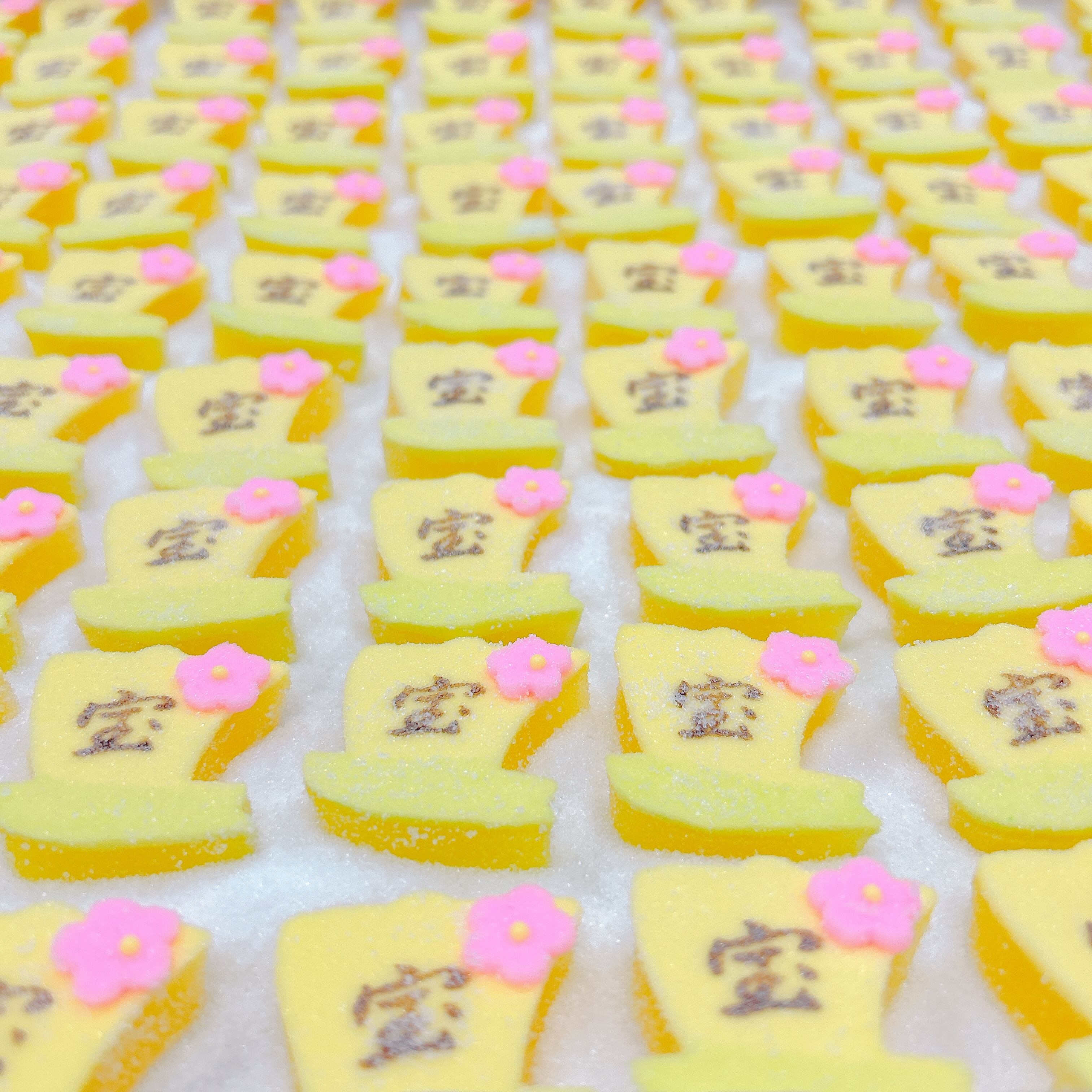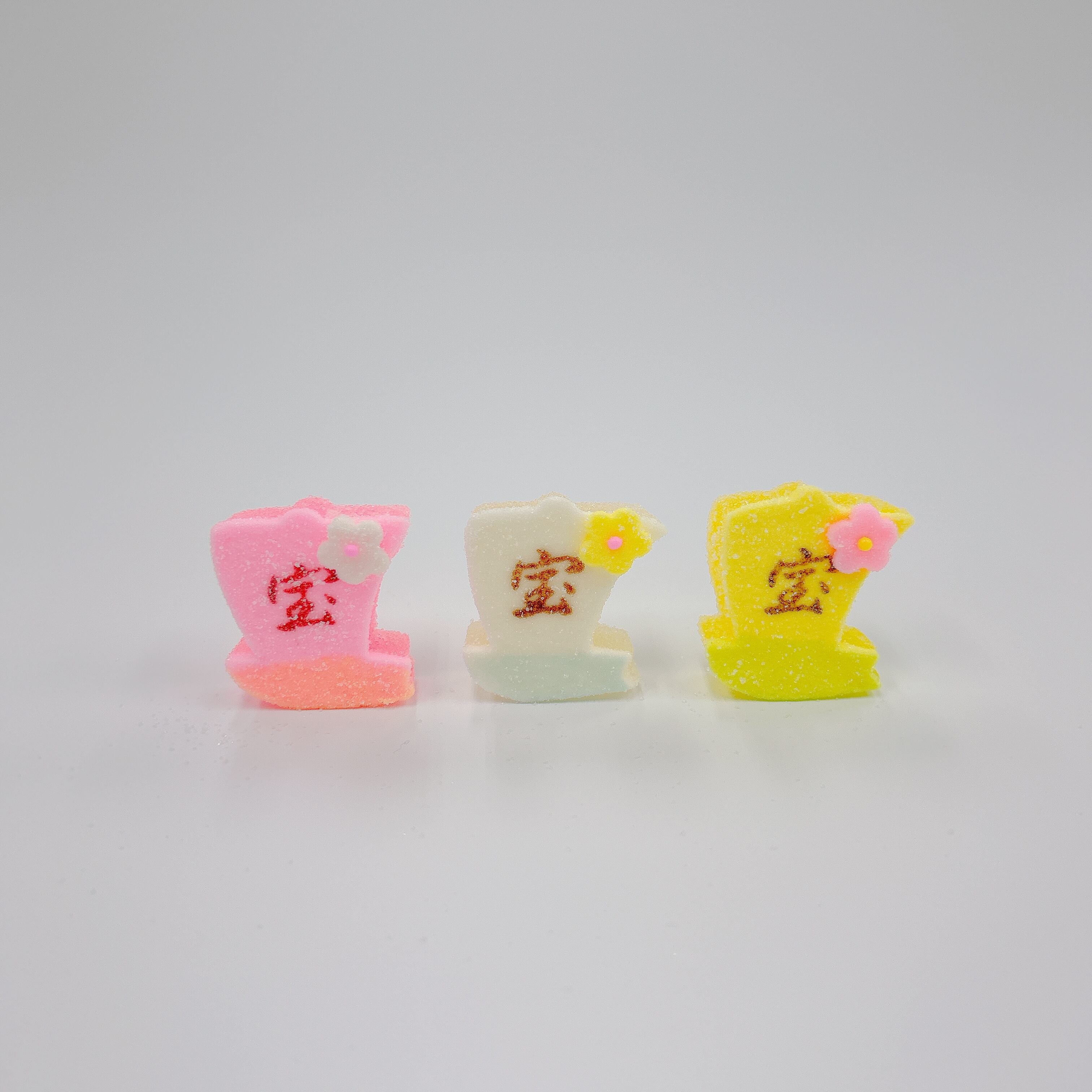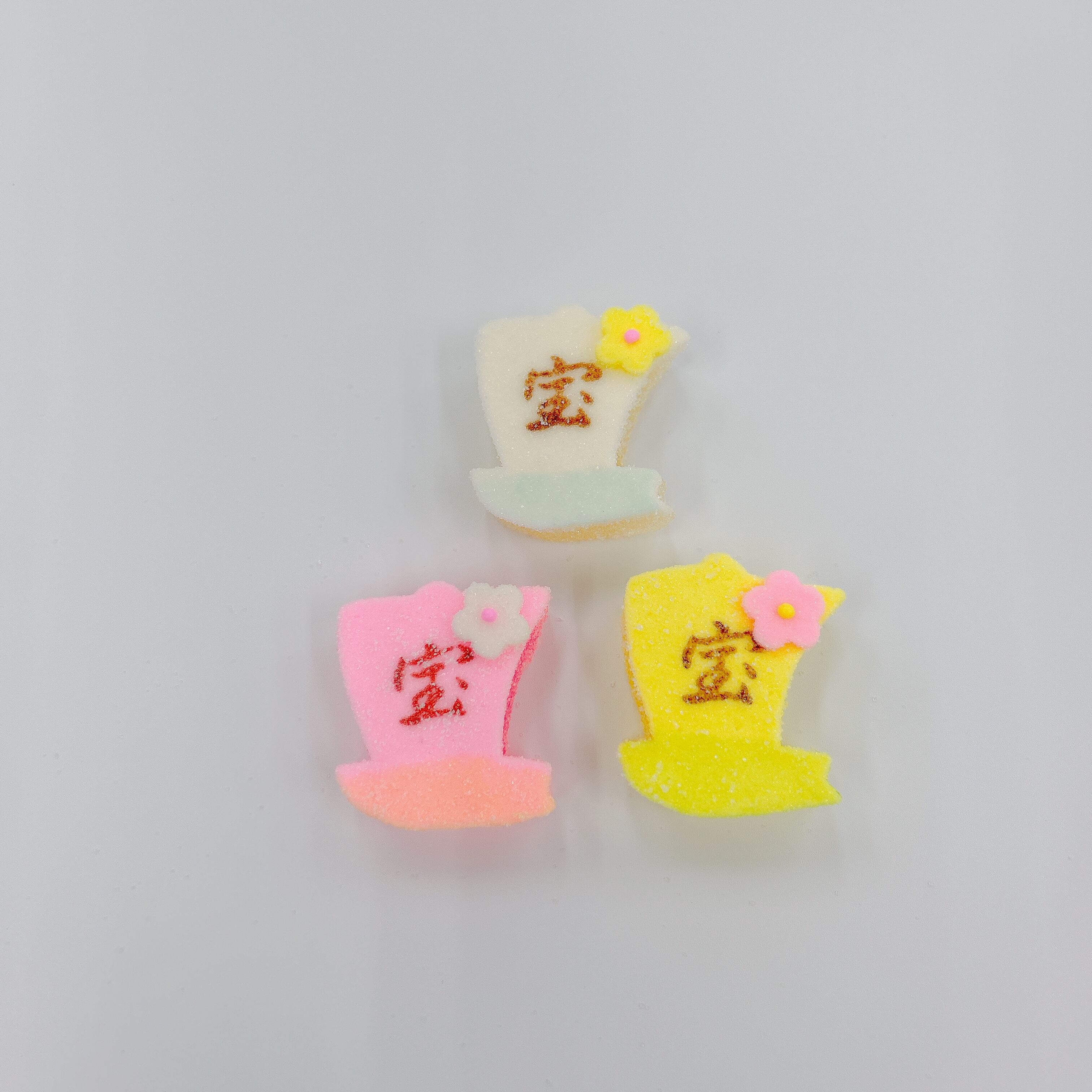3色の宝船型の細工ゼリーに梅の花を添えた冬シーズン限定の半生菓子です