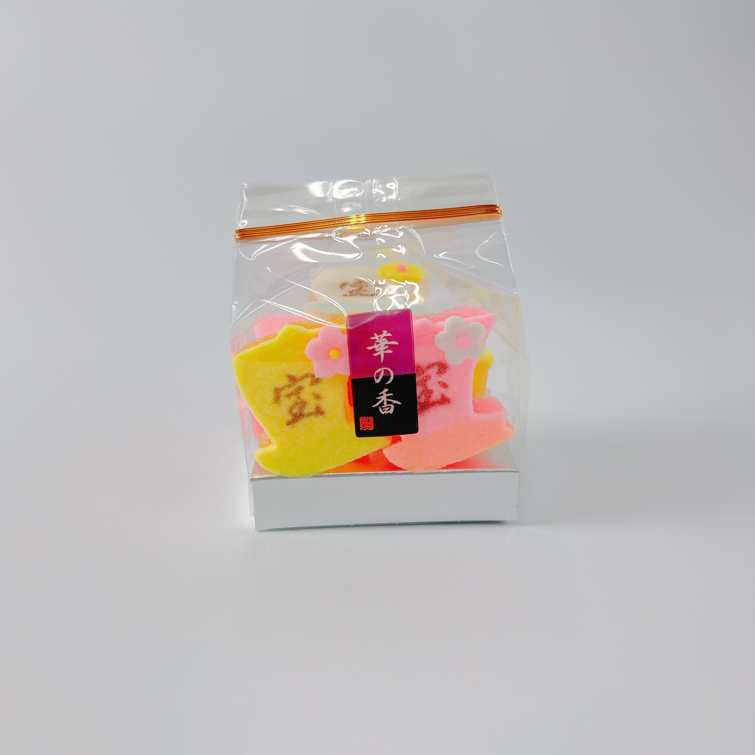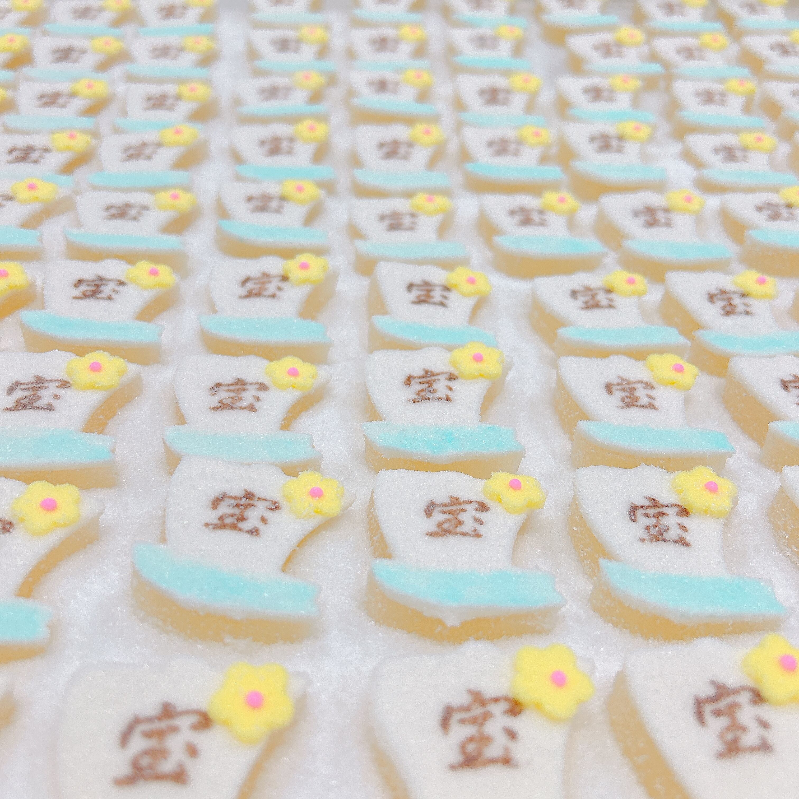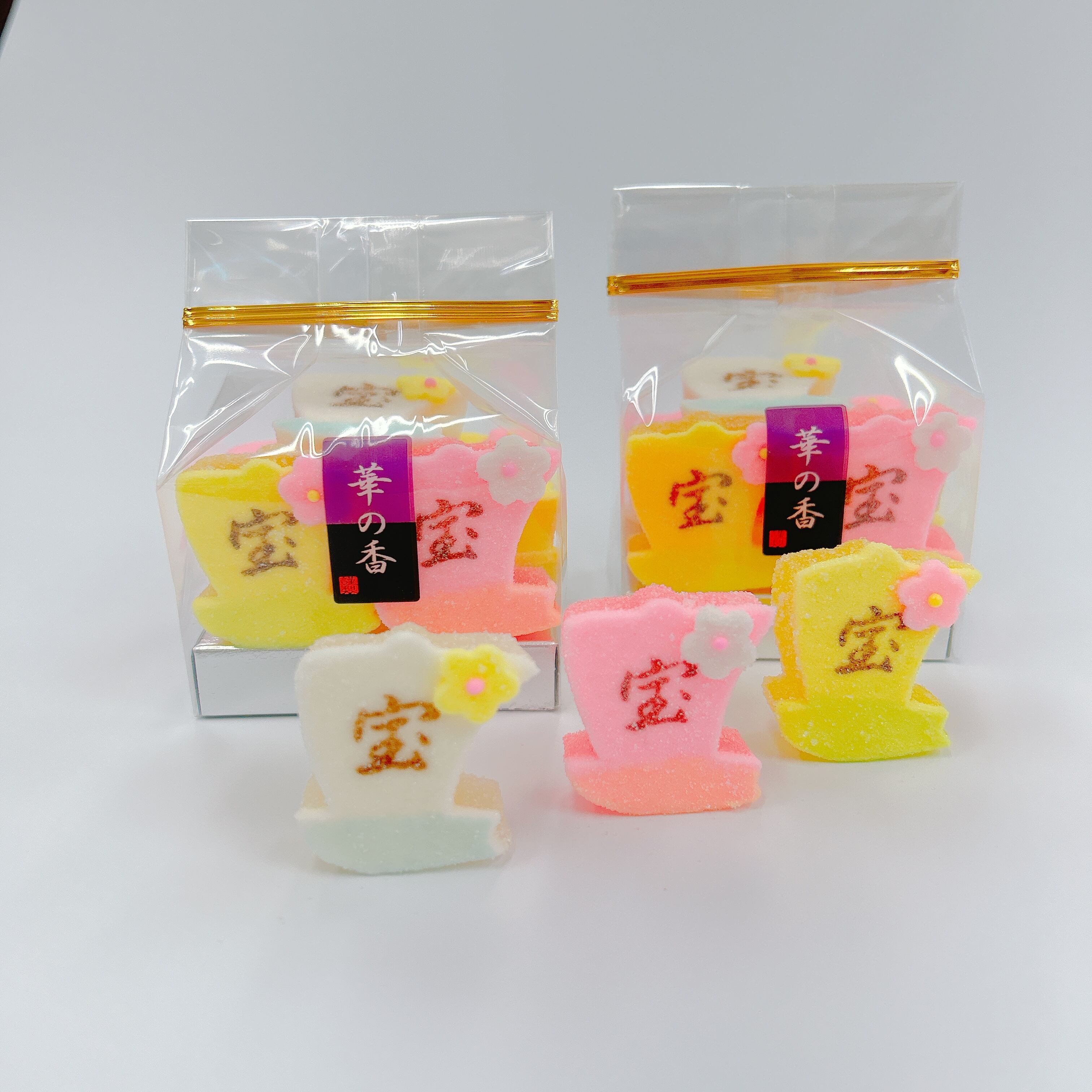 3色の宝船型の細工ゼリーに梅の花を添えた冬シーズン限定の半生菓子です