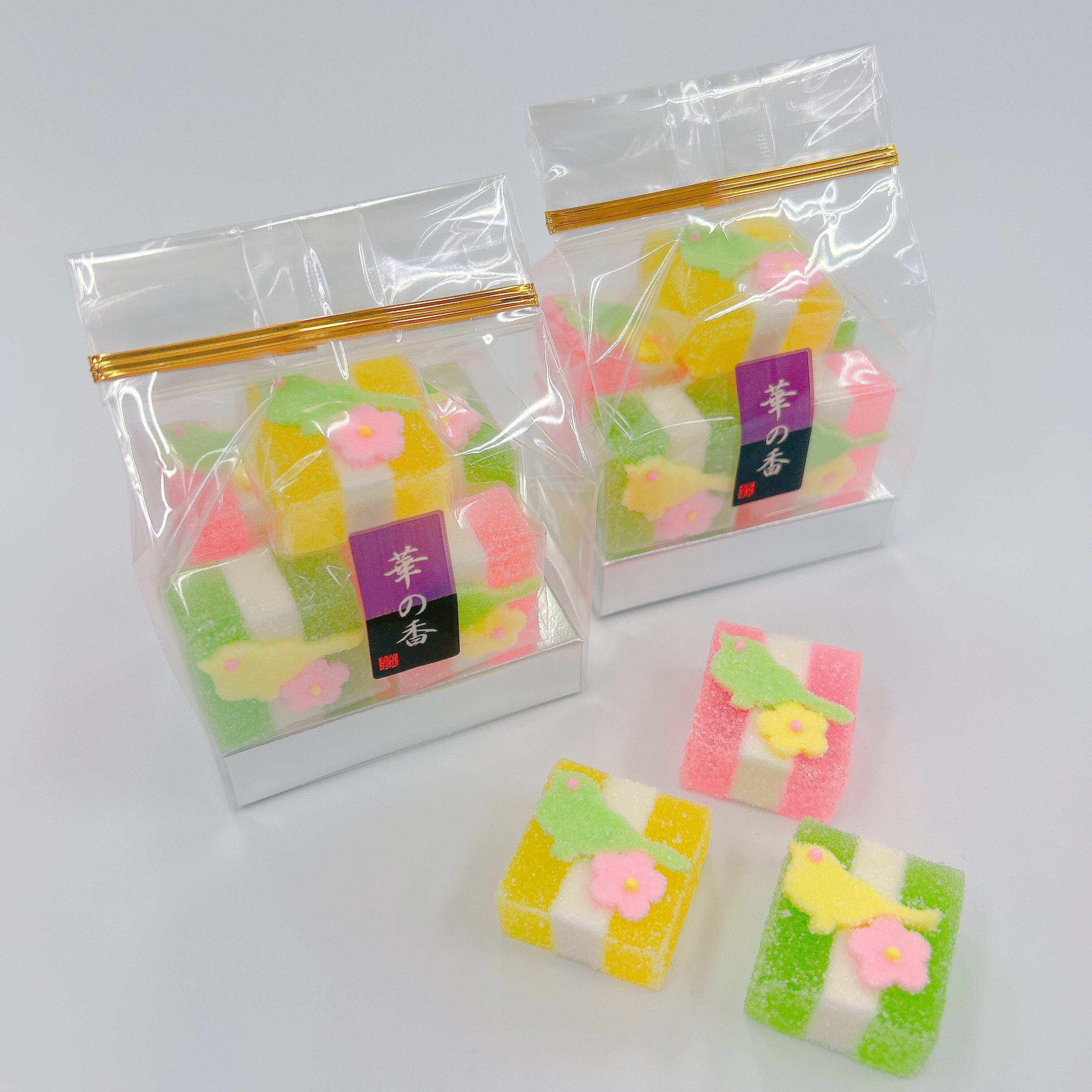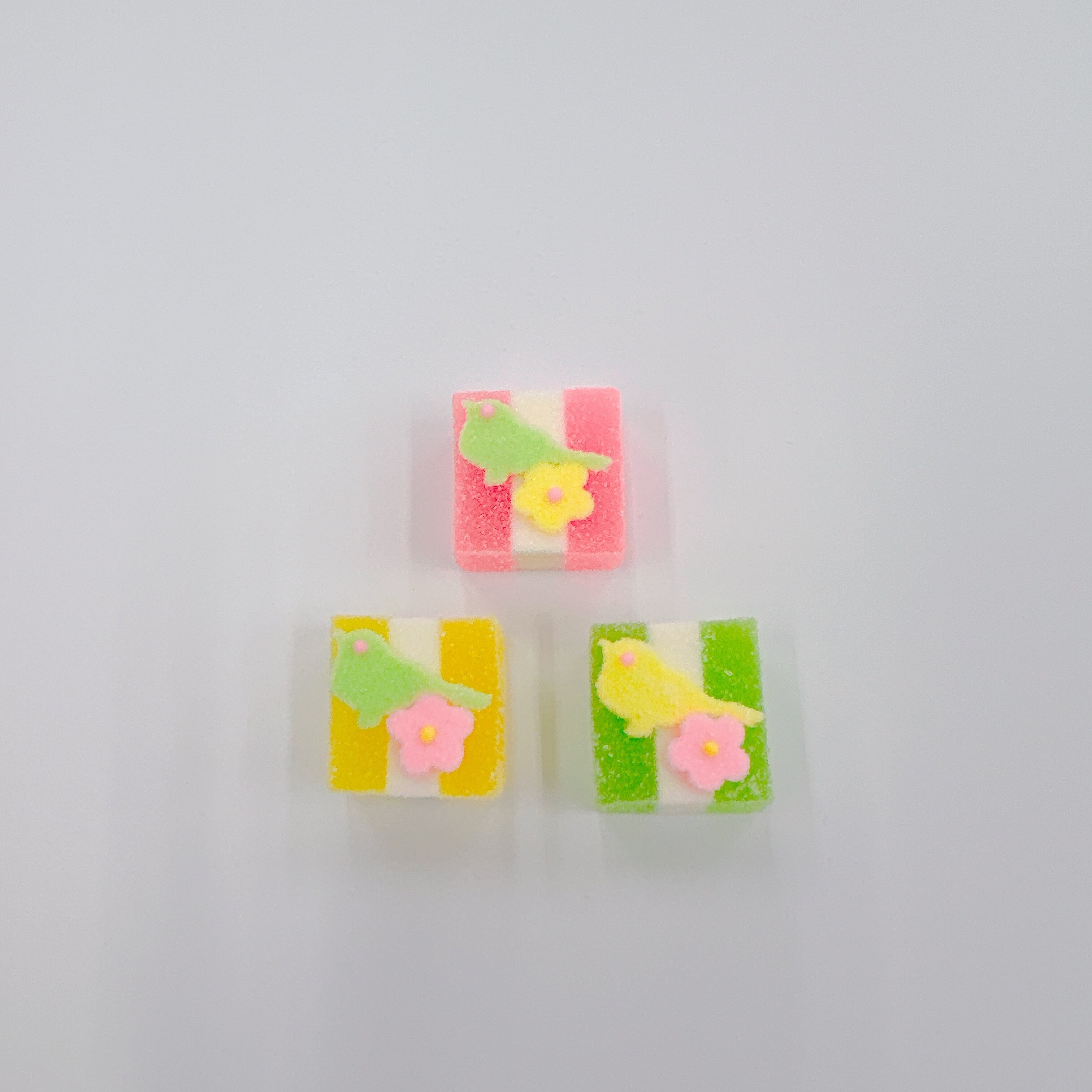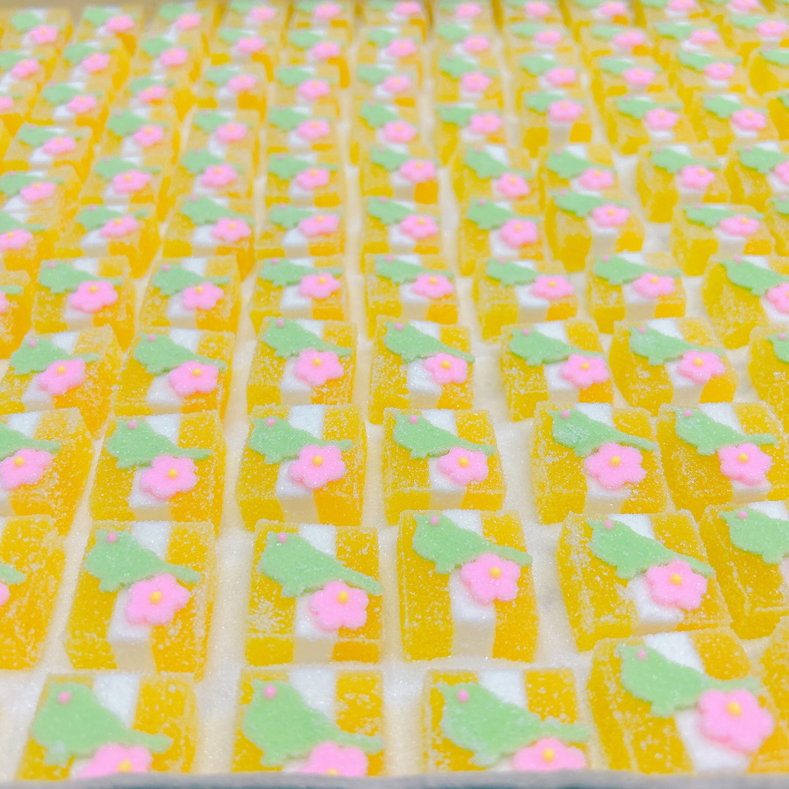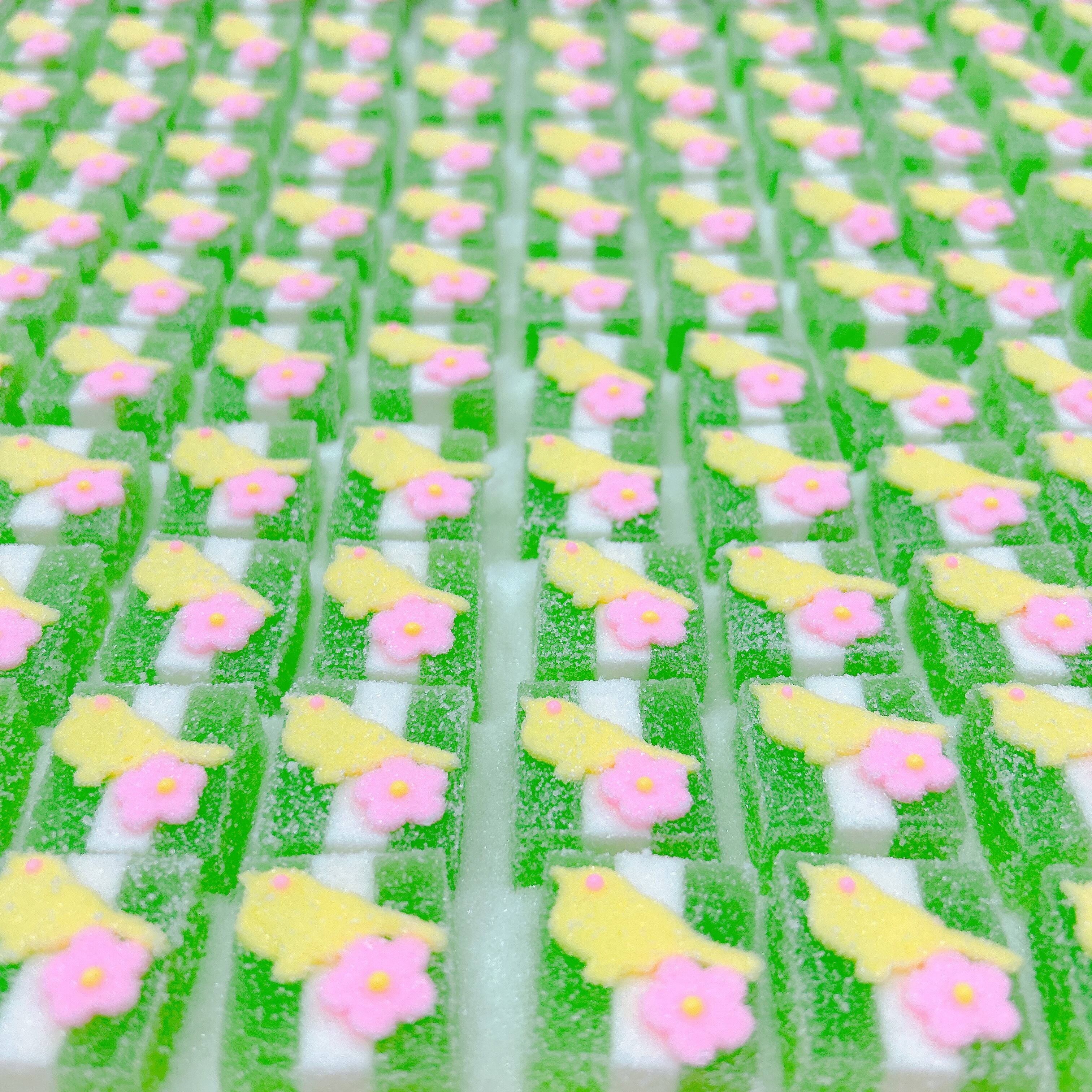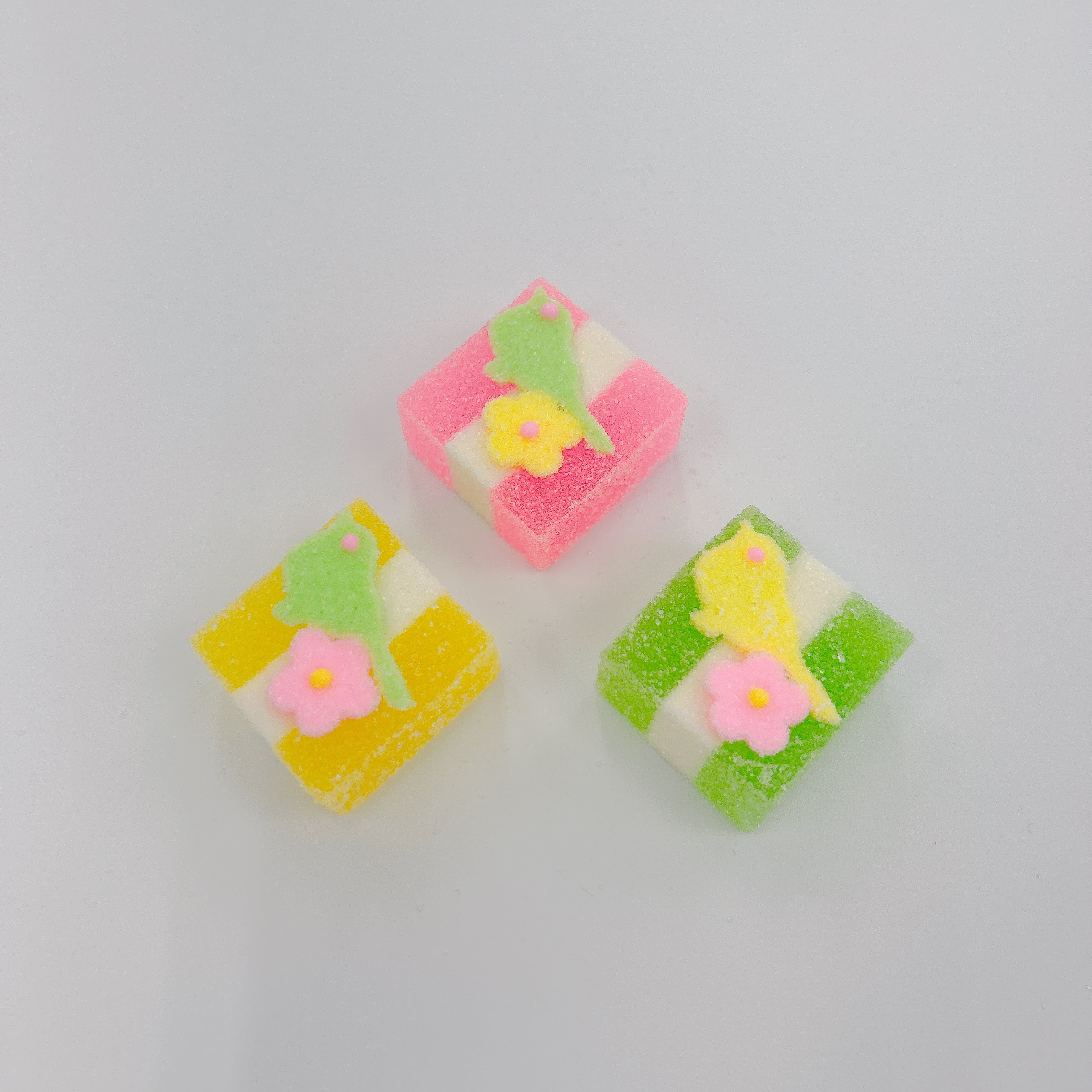 3色のゼリーにうぐいす・梅の花をそえた寒天細工ゼリーです