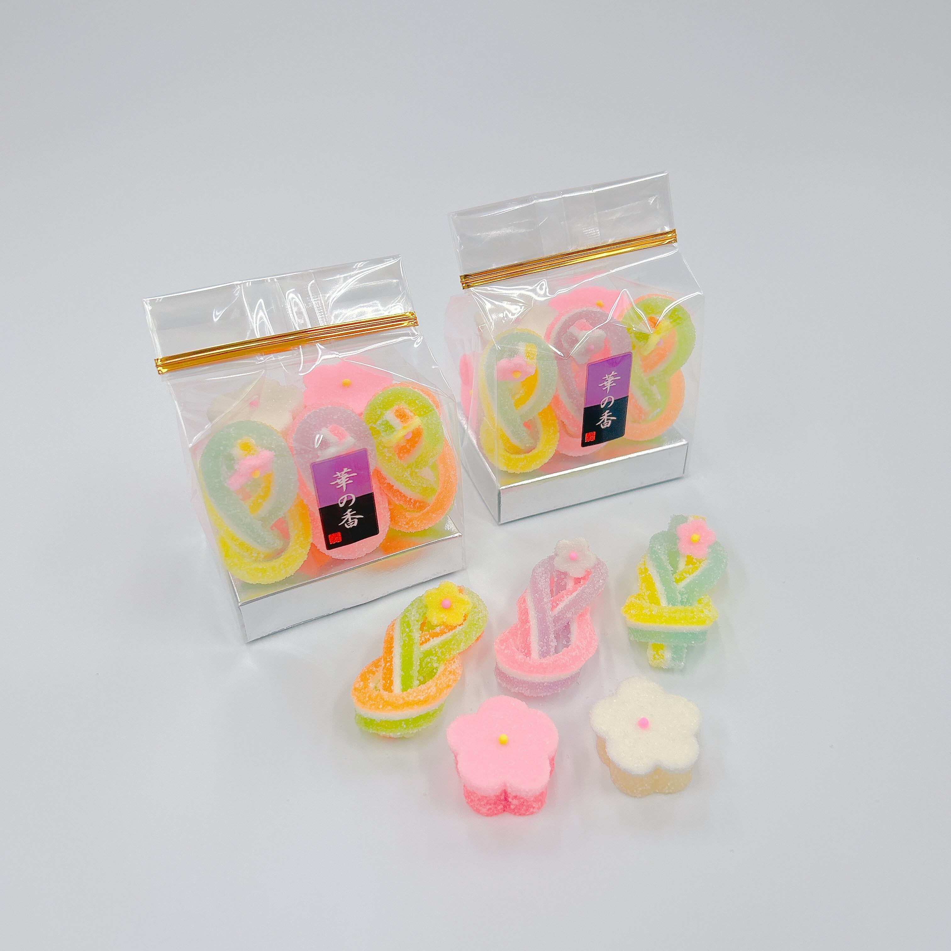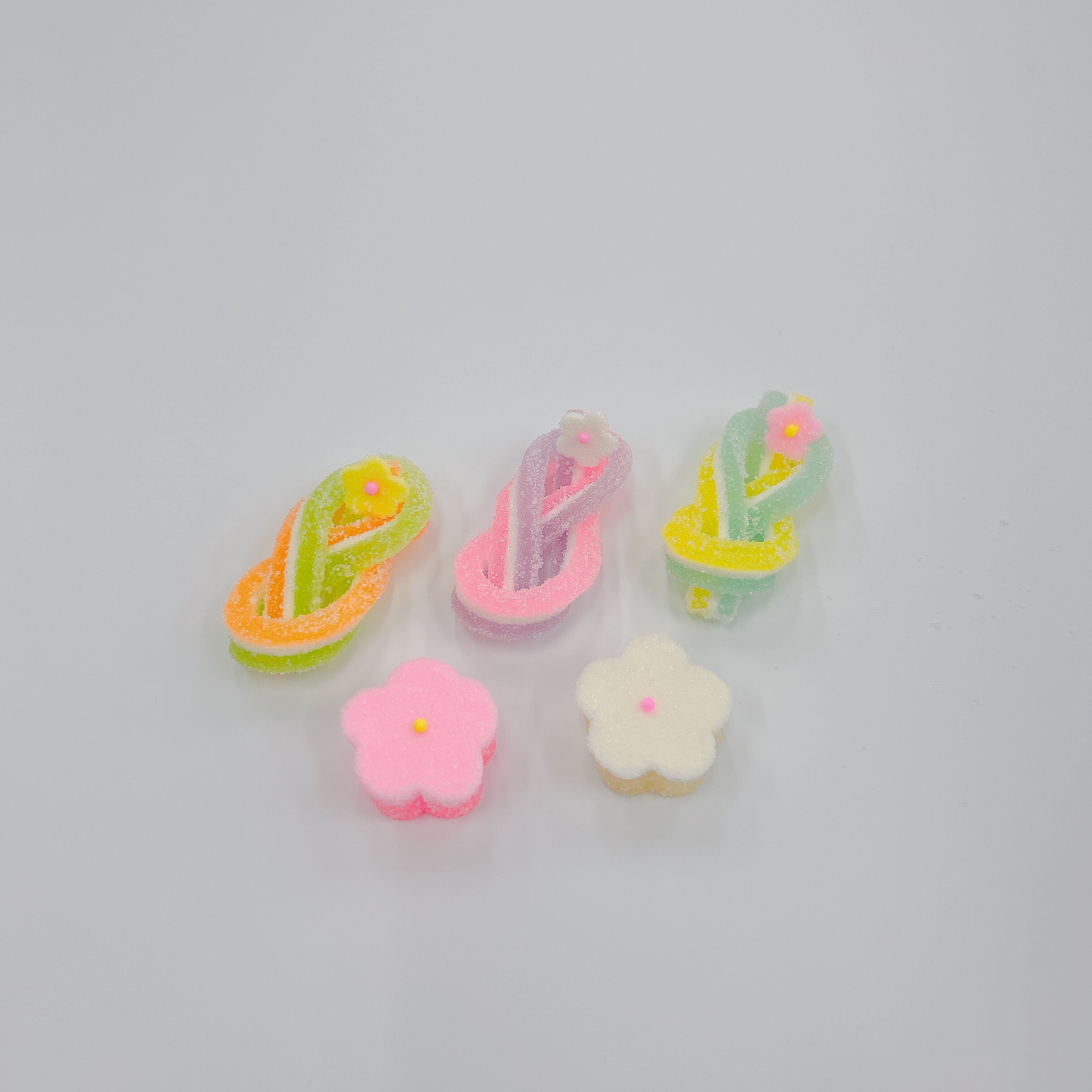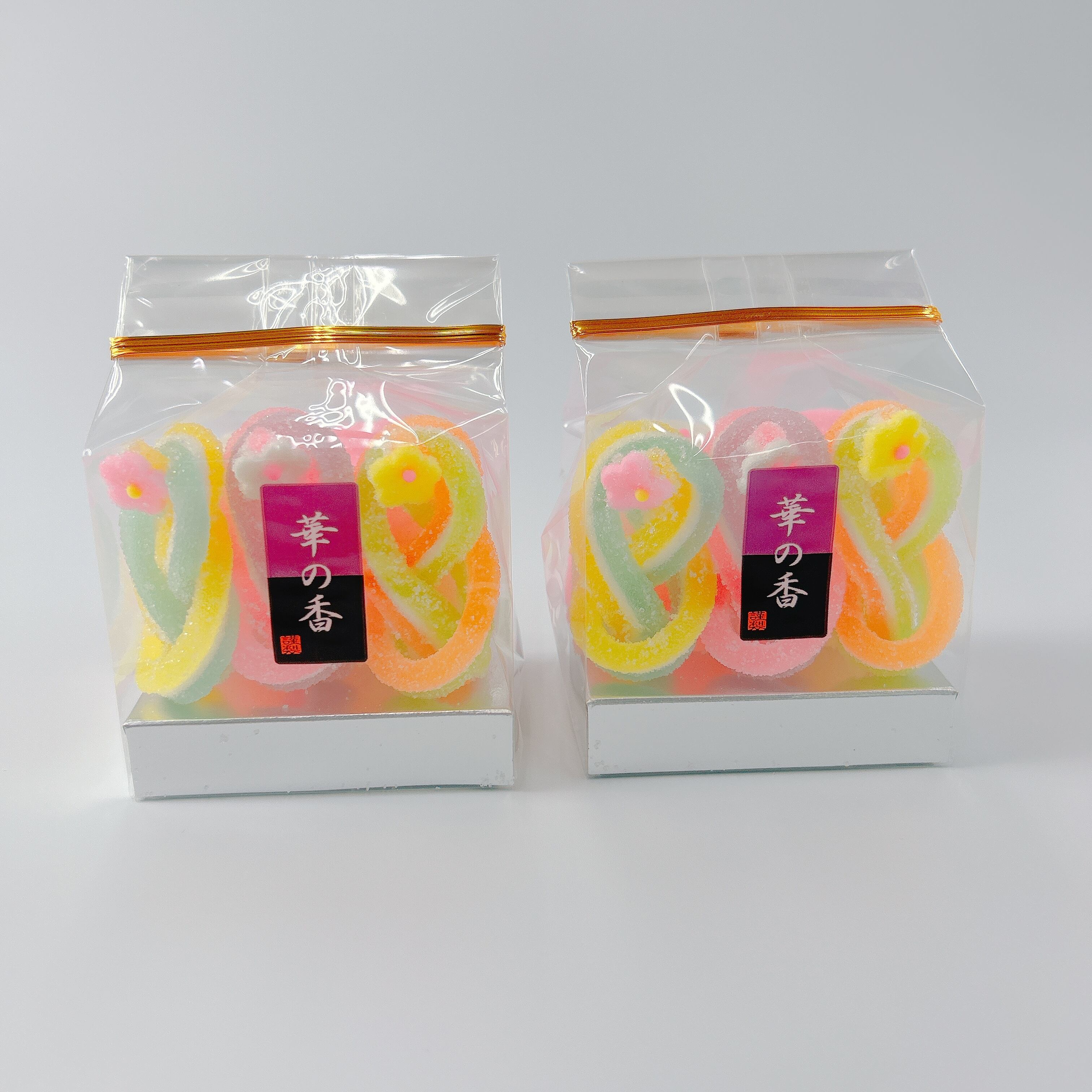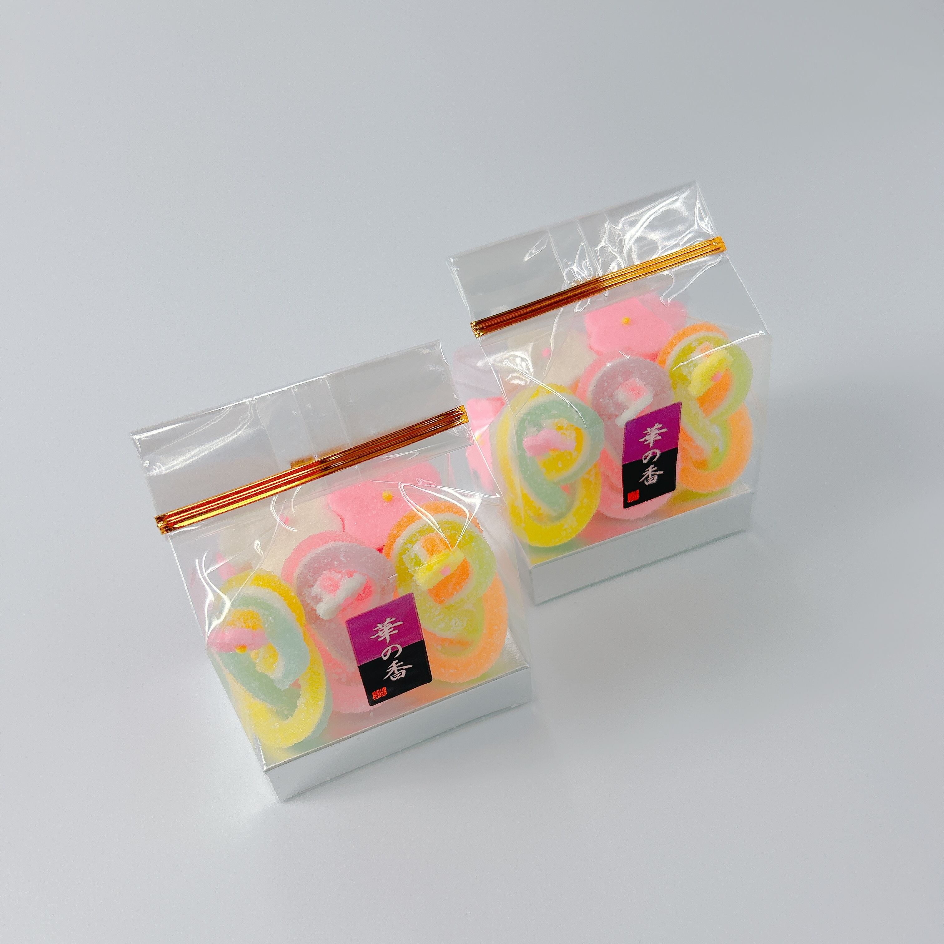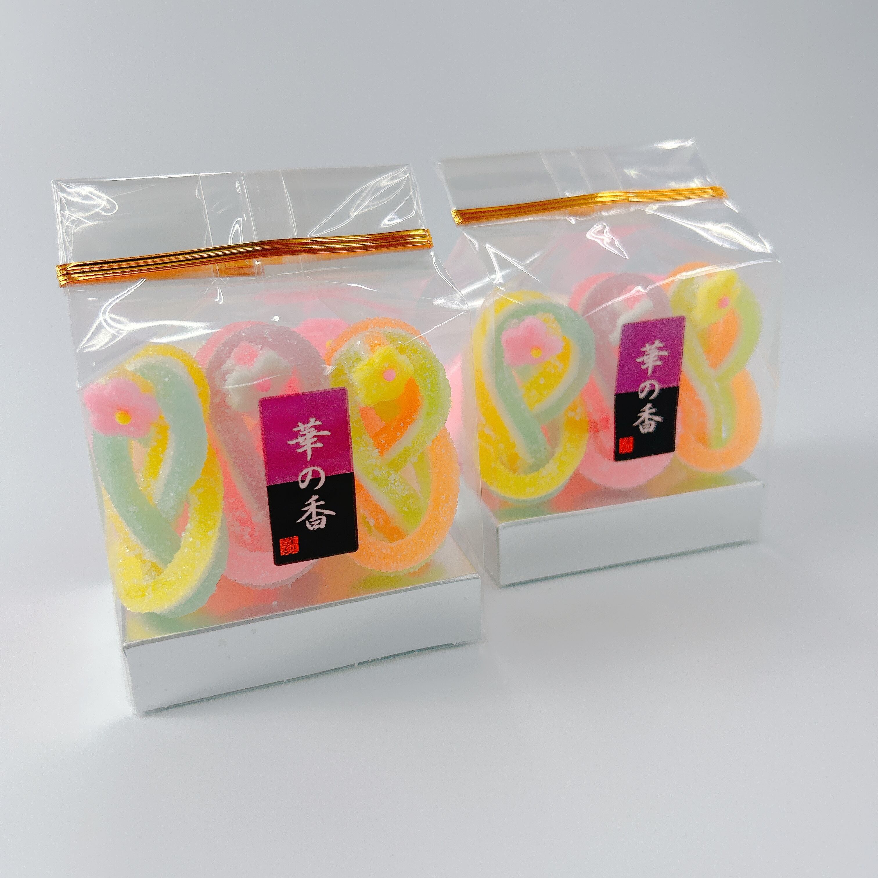 2色のゼリーと鳳瑞を合わせた3種類の千代結・紅白の梅が3個ずつ入った寒天細工ゼリーです
